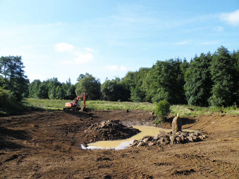 Erste Eingrabung und Niveau Angleichung an den Wannbach. Sämtliche im Aushub befindliche Steine finden sofort Verwendung als Befestigung, als Naturrückzug und als optische anmutende Wächter