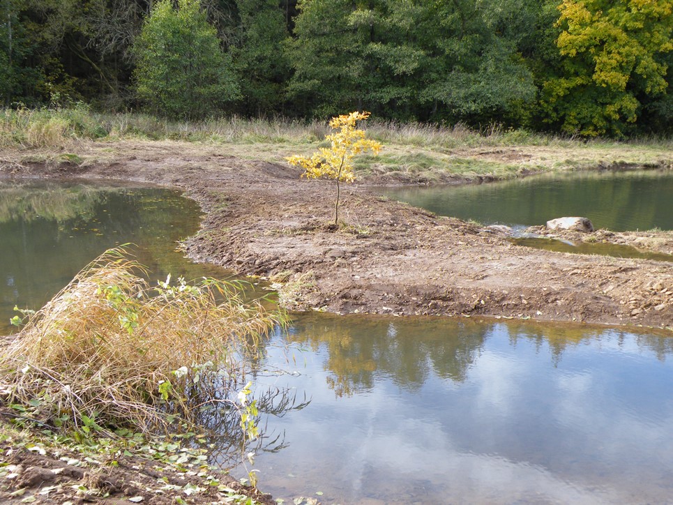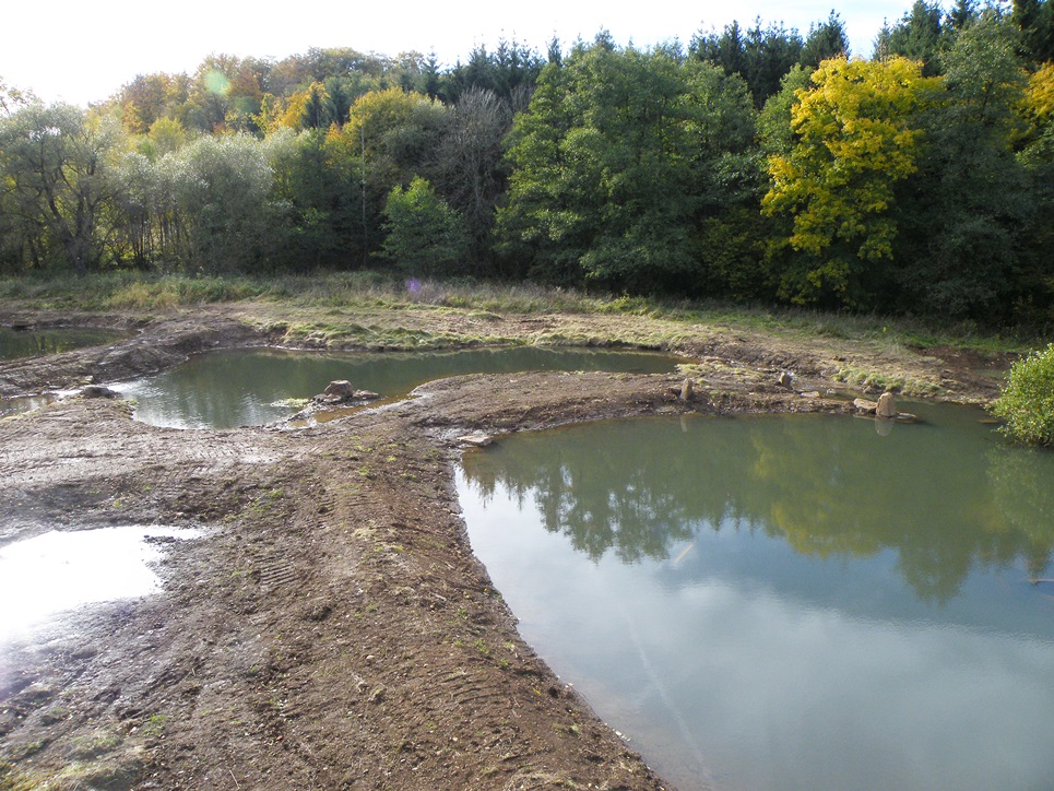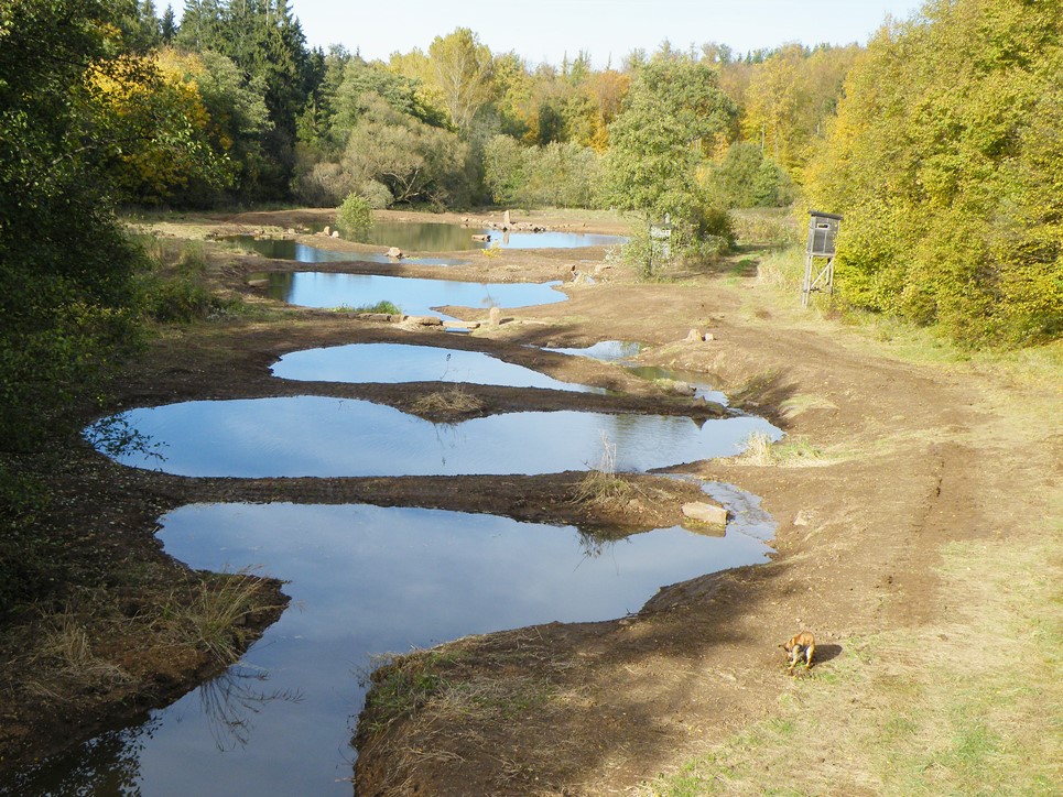 Die Anlage der verschiedenen Teich-stufen nach der Fertigstellung. Durch diese Perspektive ist der dominierende Wasserspeichereffekt deutlich erkennbar. Sekundär entsteht naturnahes Biotop.